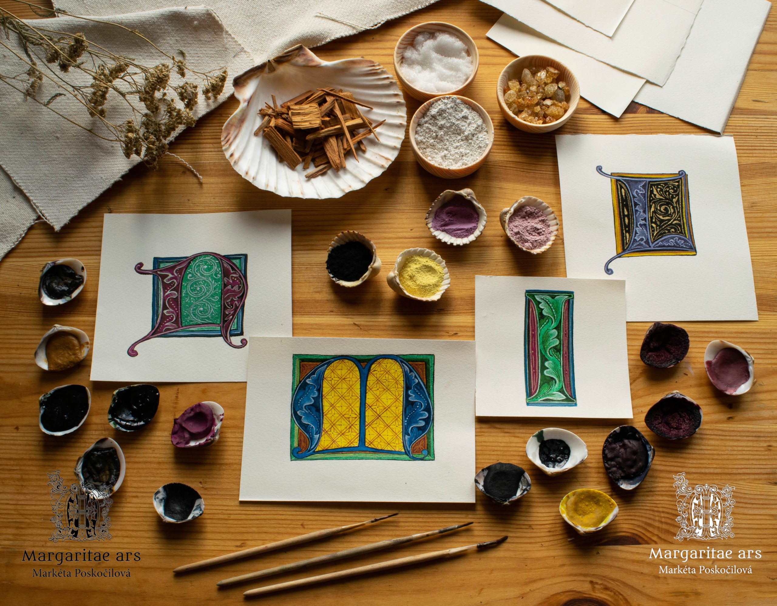 Z kurzu si odnesete vyrobené rostlinné pigmenty (z brazilského dřeva, řešetláku, černého bezu etc.), vlastní návrhy iniciál a návody na jejich konstrukci.